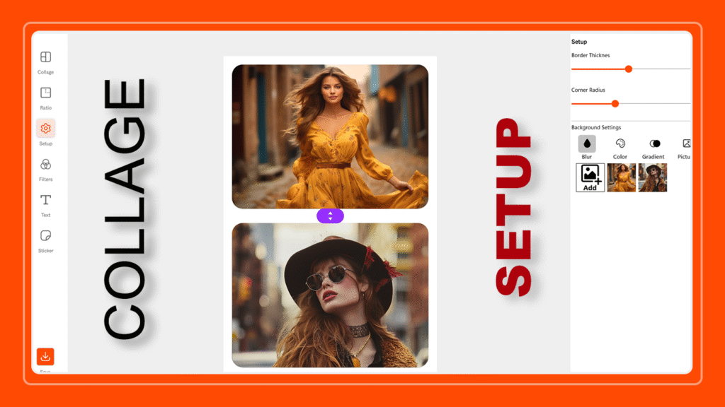 Click on the Setup option to fine-tune your collage. In this section, you can adjust the border thickness, corner radius, and background settings. The background options include Blur, Color, Gradient, and Picture. You can also modify the spacing between photos and further refine the corner rounding. Use the sliders or enter specific values to customize the collage layout exactly the way you want it.