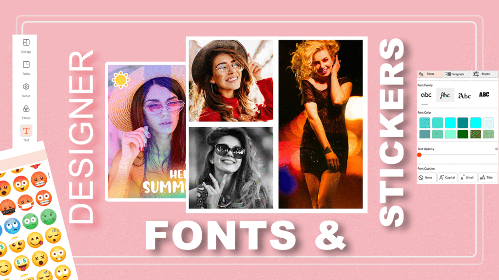 Click on the Text icon to add captions, quotes, or titles. You can edit the font style, color, size, and alignment. Move the text freely around the collage until it looks right.