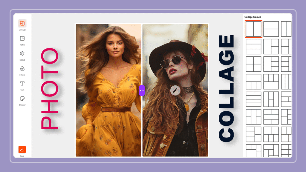 Next, click on the Collage icon from the toolbar. Browse through the available collage frames and templates. Each layout offers different grid styles and image arrangements. Select your preferred frame, and the app will automatically position your selected photos.