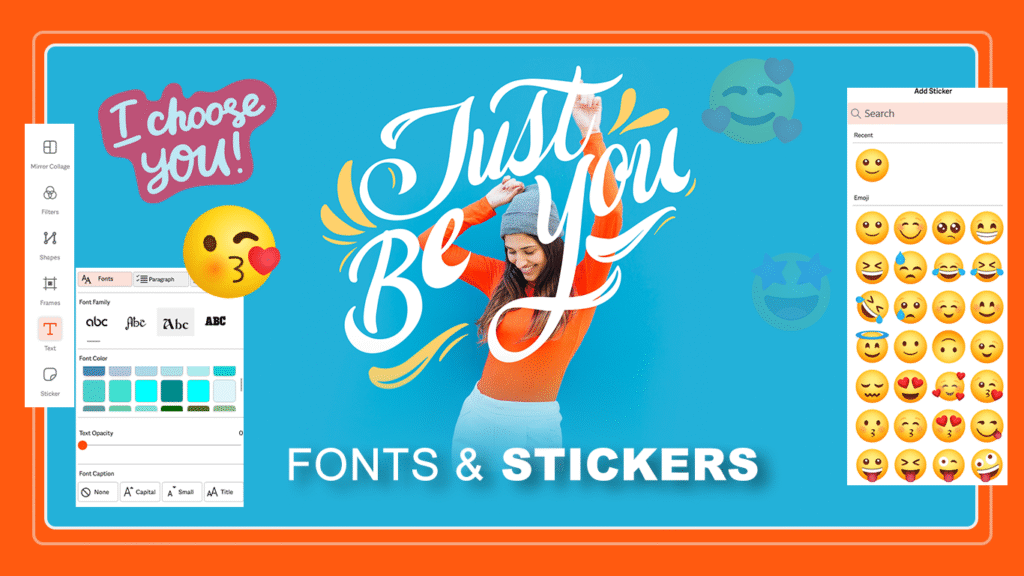 Click on Sticker to browse through a library of icons, emojis, and decorative stickers. Choose one or more that match your theme. You can resize, rotate, and move stickers freely to enhance your design.